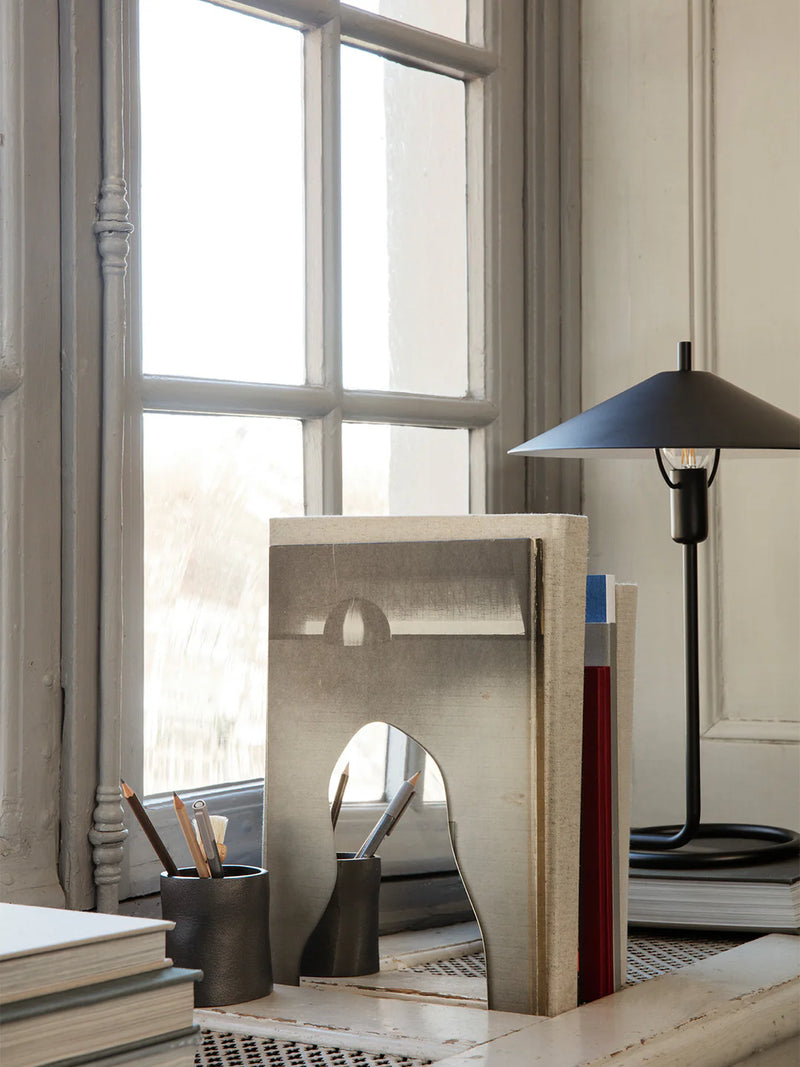 A könyvek személyiséget és otthonosságot visznek a térbe, a könyvtámaszok pedig funkcionális szobrokká válnak — apró, mégis karakteres installációk a polcokon.